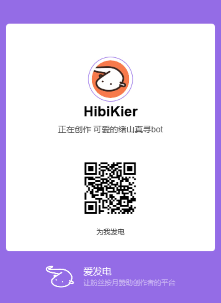 用爱发电,某些功能学习借鉴了大佬们的代码,因为绪山真寻实在太可爱了因此开发了 绪山真寻bot实现了一些对群友的娱乐功能和实用功能大概